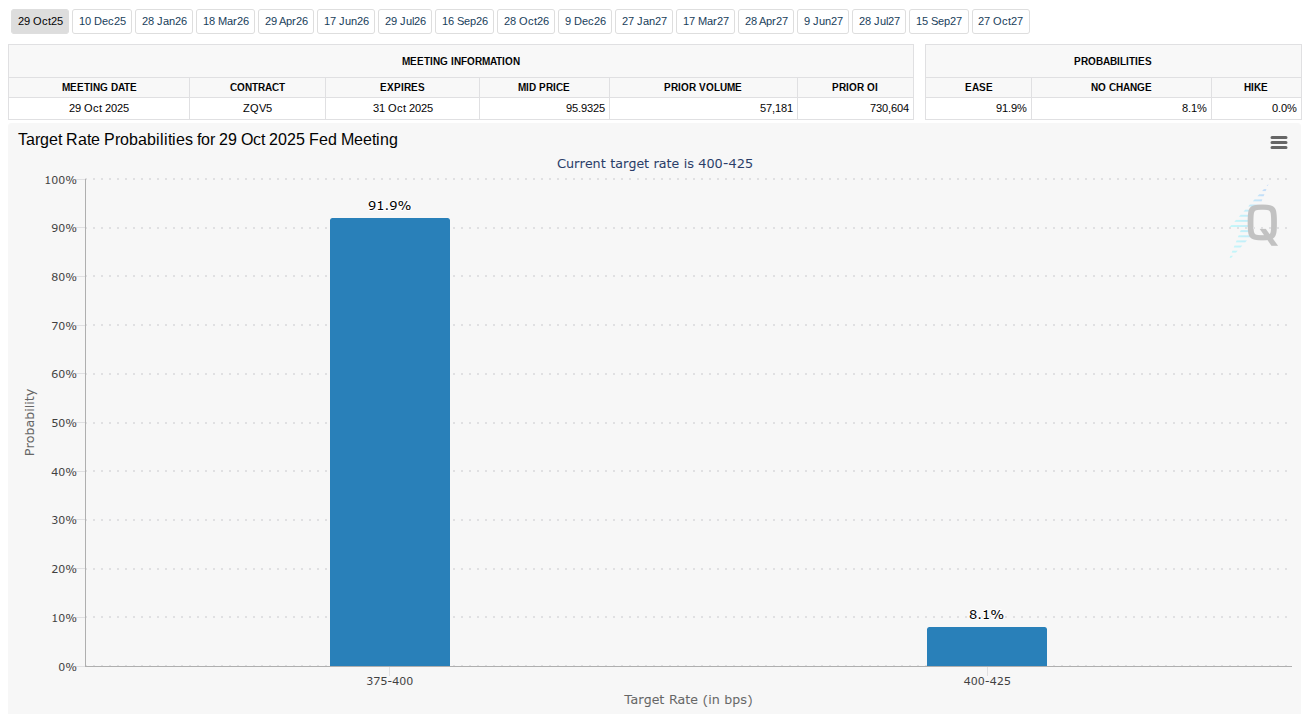 CME Grubu Fedwatch aracının verileri, 29 Ekim tarihli Fed toplantısının beklentilerinin, yüzde 0,25'lik başka bir azalmanın bir başka azalmasının bir başka azalmasının olduğunu gösteriyor.