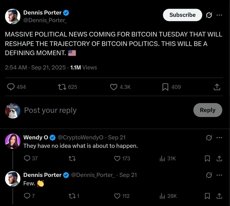 Duyurunun tam kalitesi bilinmiyor, ancak Dijital Etkinlikler Politikasının Lobisi CEO'su ve Ortak Dennis Porter, Satoshi Fonu ve Kurucu Ortak Politikasının Lobisi, X Pazar günkü bir paylaşımda sözünü yerine getirmedi.